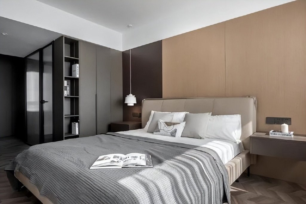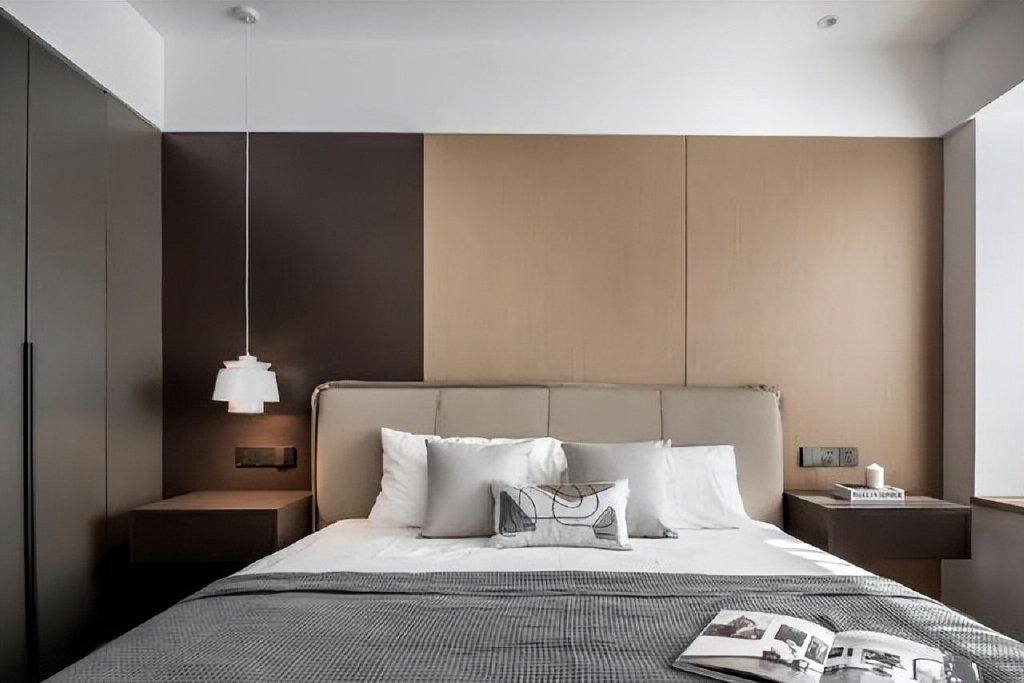 床头两侧定制的悬挂式床头柜,既实用又好打理;好的