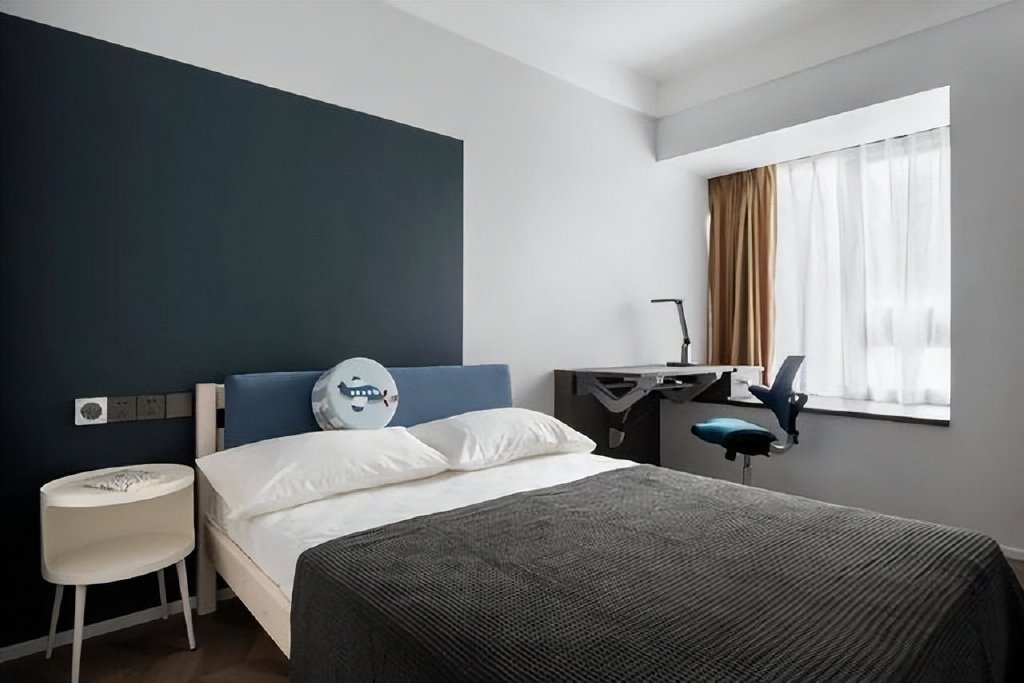 男孩子的房间里以蓝色为主题色,进门处的收纳柜和床侧的书柜连成整体增大了储物空间