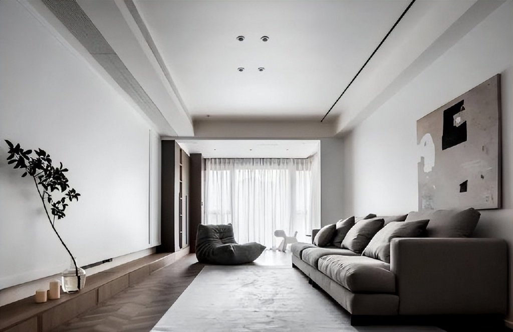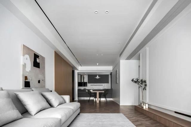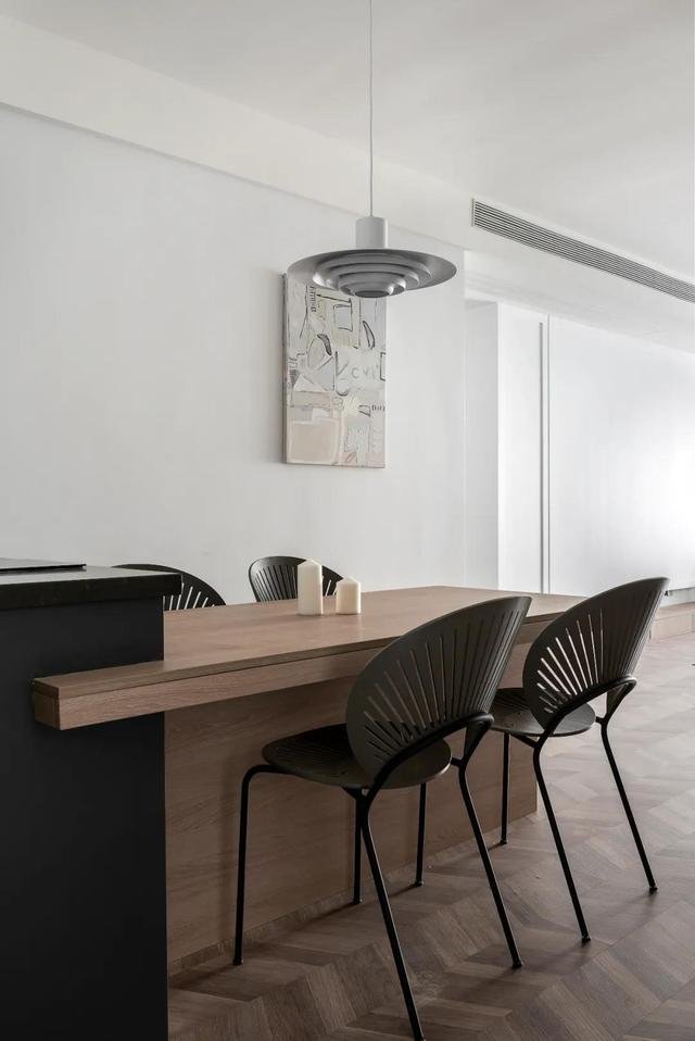 略微跳色的地面既大气又不会觉得单调;客餐厅一体式的吊顶用黑色的磁吸灯连接彼此也拉伸了空间感。