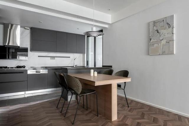 一套107平从入户门进到室内有一个小玄关作为室内外空间的一个过渡,靠墙一侧定制了一组鞋柜解决了门厅的收纳问题,进到室内就是餐厅的空间;厨房采用开放式的设计,让餐厅和厨房连接为一体,这样一方面可以增加空间的通透感另一方面也增加了空间与空间的互动性;灰色的橱柜搭配白色的墙面很有高级感。