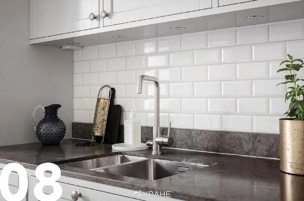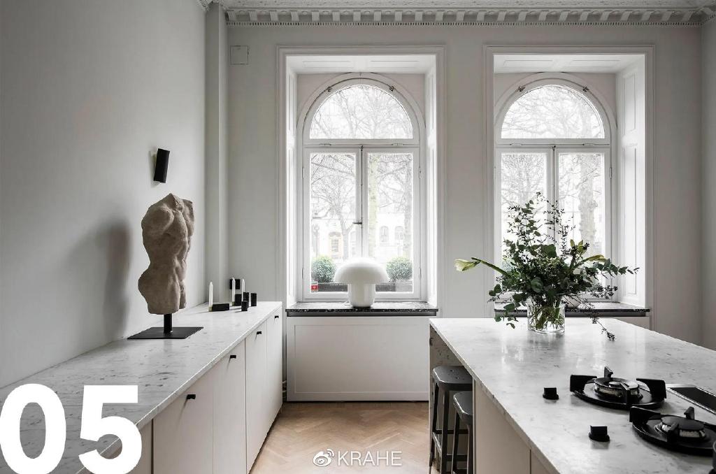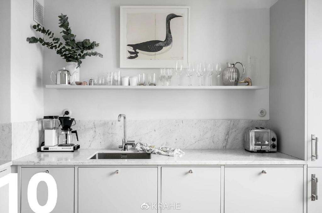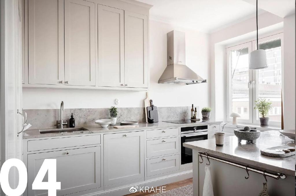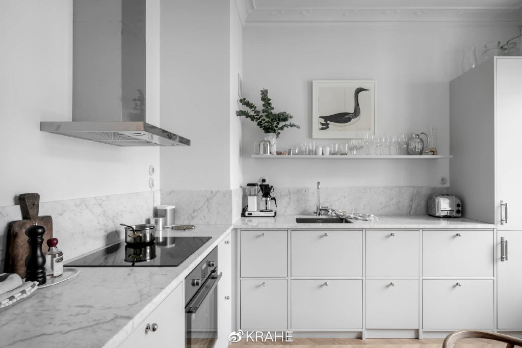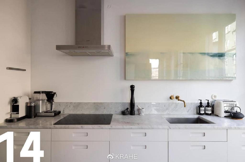 这间厨房没有上一个厨房的炭黑色台面,取而代之的的颜色浅的多的大理石,并且延伸至墙面,作为背板,在白墙面和白橱柜之间做了分割。