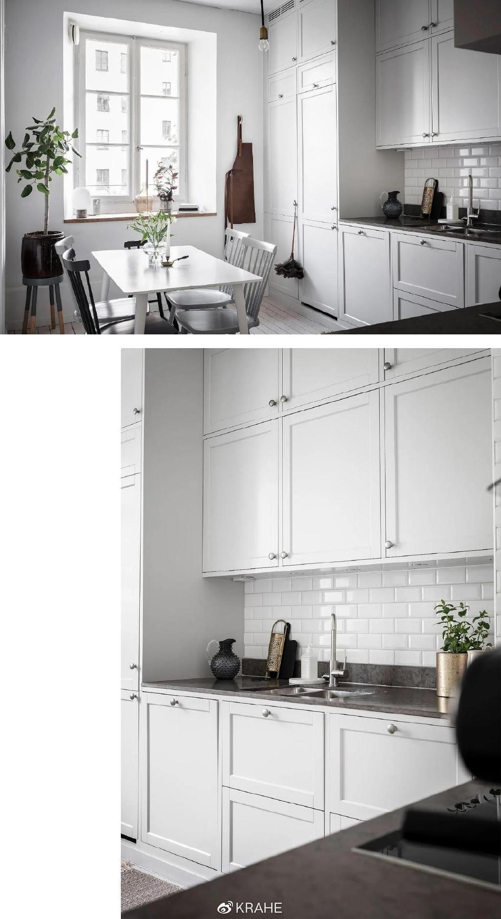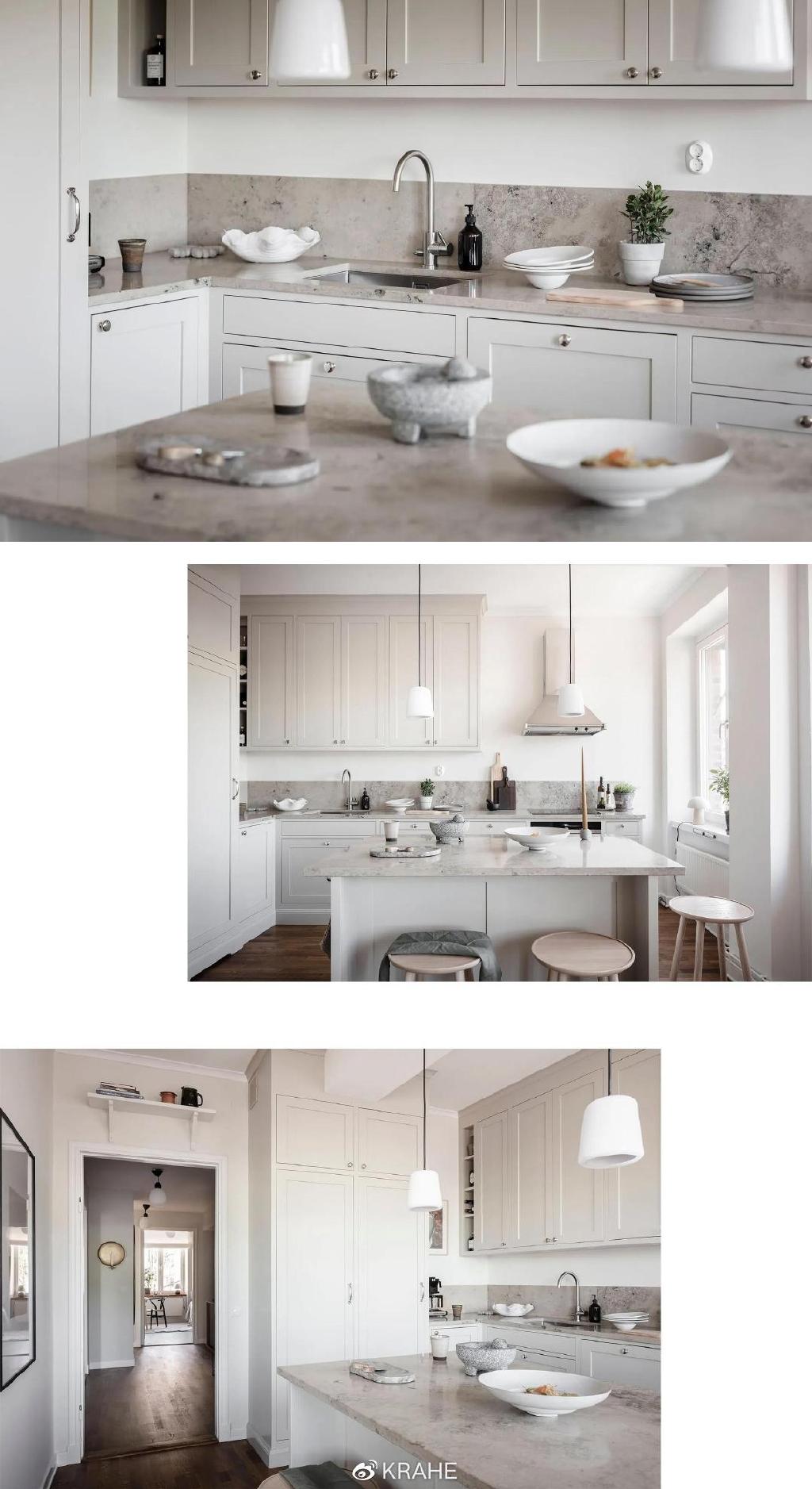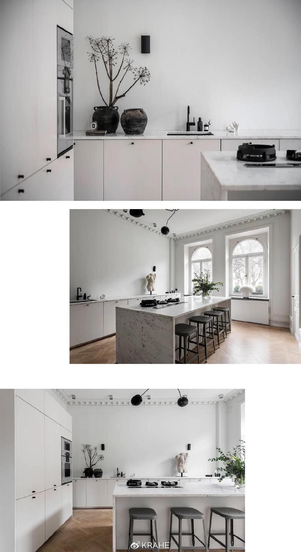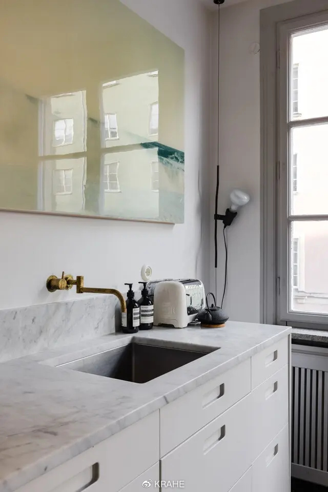 这间厨房没有上一个厨房的炭黑色台面,取而代之的的颜色浅的多的大理石,并且延伸至墙面,作为背板,在白墙面和白橱柜之间做了分割。