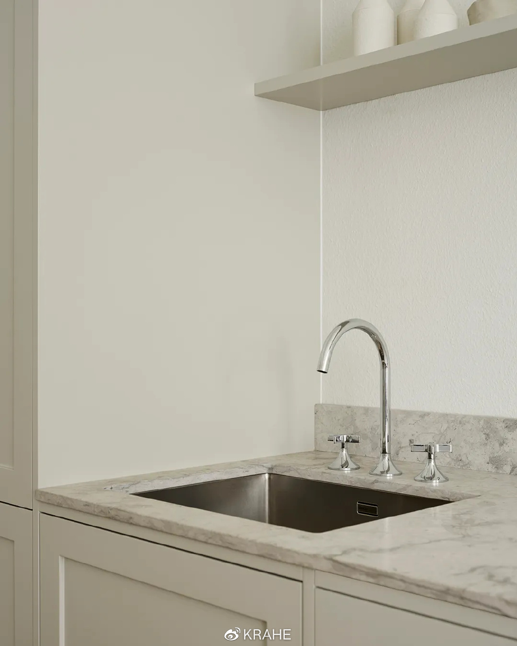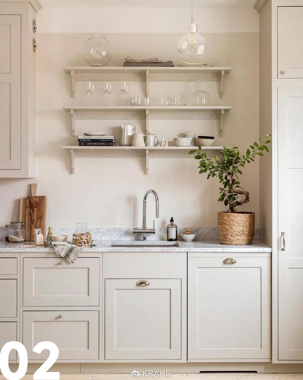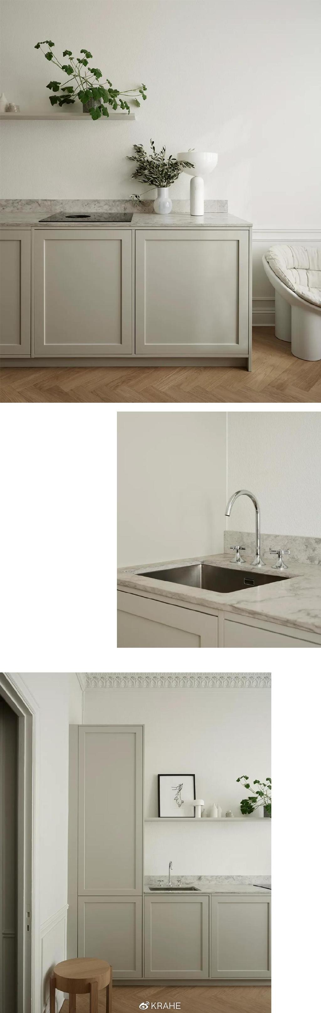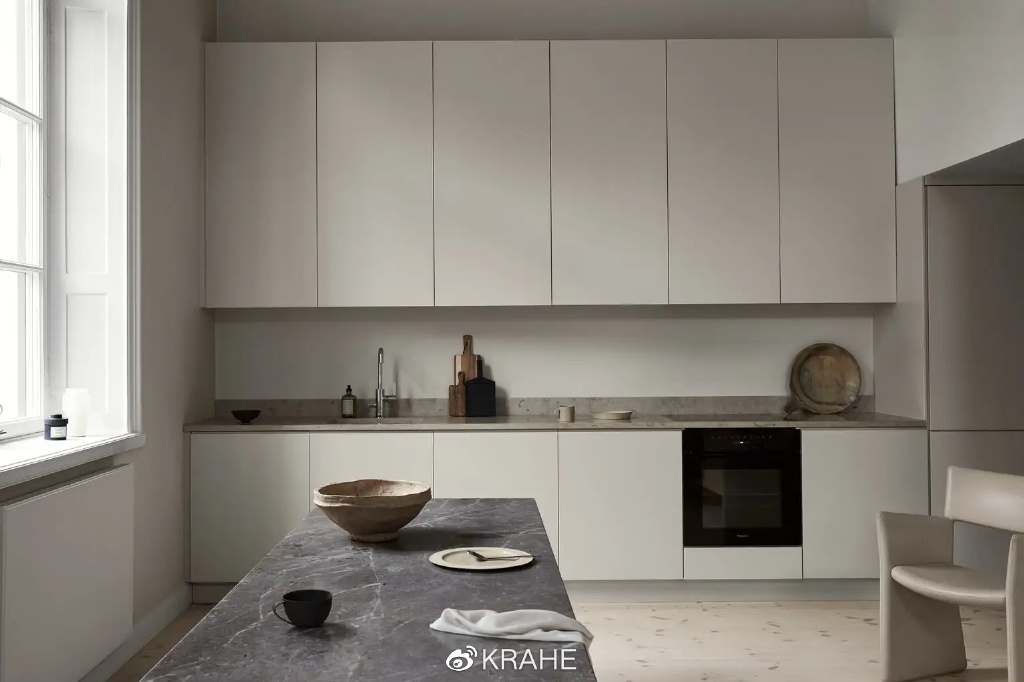 这间厨房没有上一个厨房的炭黑色台面,取而代之的的颜色浅的多的大理石,并且延伸至墙面,作为背板,在白墙面和白橱柜之间做了分割。