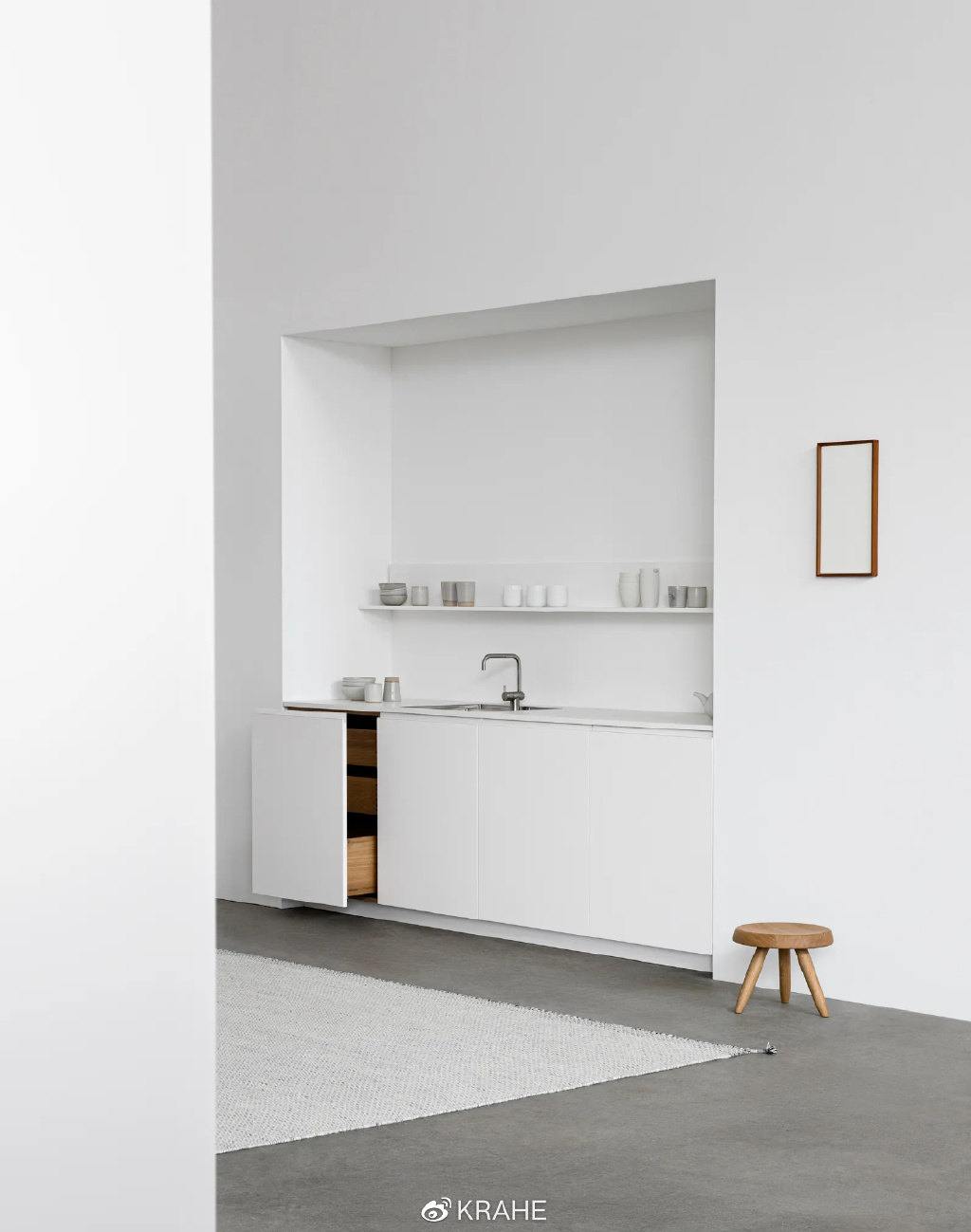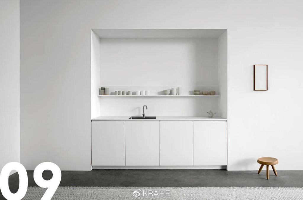 这是一间全白的厨房,极简主义的极致表达。这间厨房真正出彩的并不是纯白色,光滑的纯白墙面、橱柜只是背景。真正的重点是深灰色的微水泥地面。