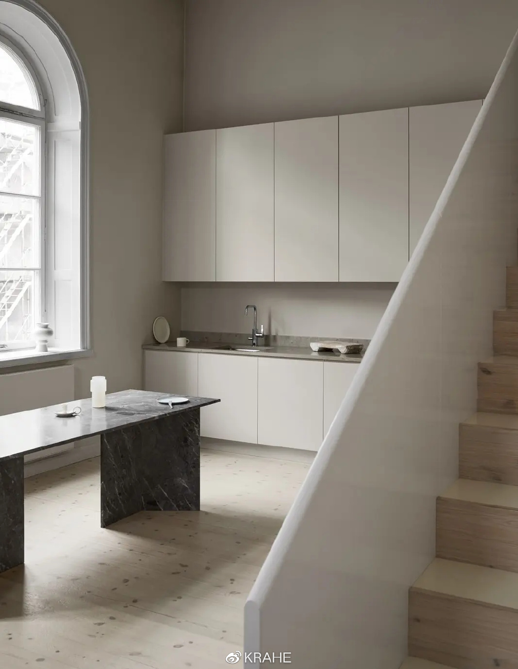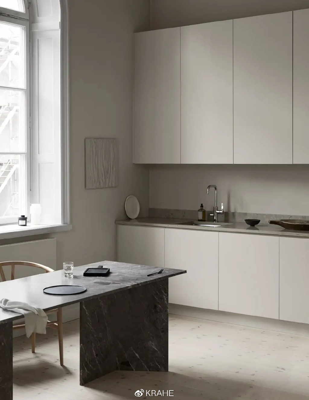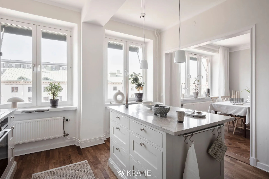 白色的墙面、白色的橱柜和浅色的橡木硬木地板被石英石台面所温暖,窗边令人印象深刻的黑色大理石餐桌给整个色调带来了一些对比。