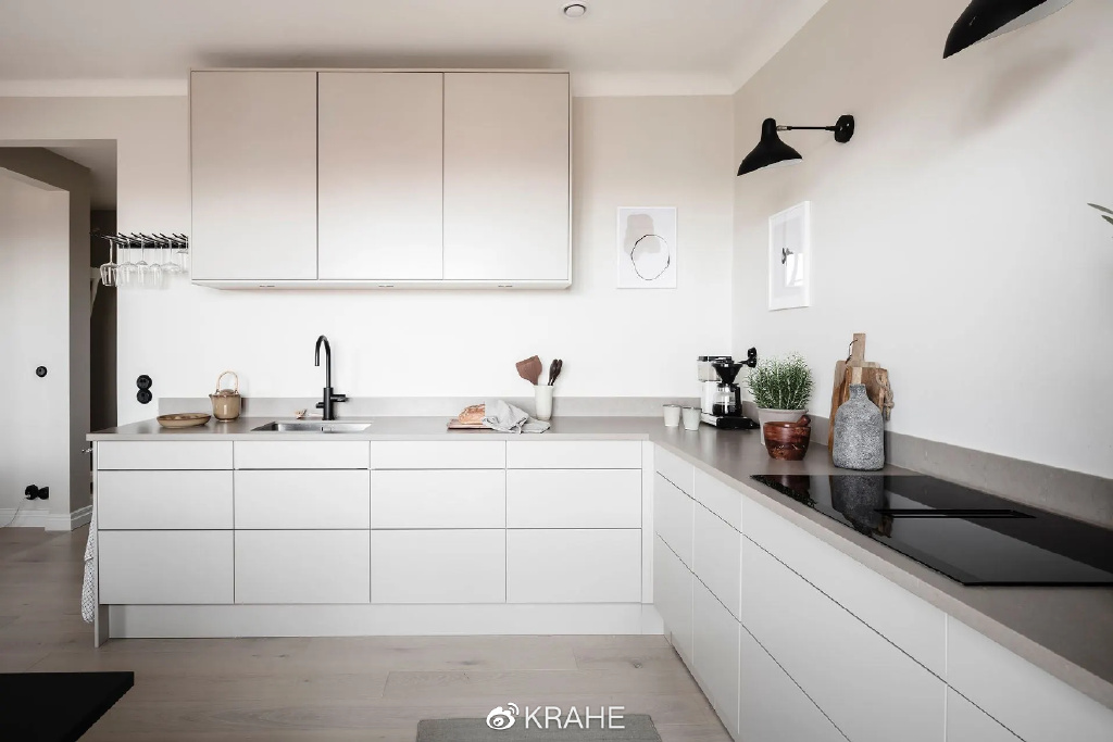 这是一个全白色调的厨房,墙面、橱柜、瓷砖全是白色。设计师利用炭黑色的石英石台面打破了纯白色的无聊。