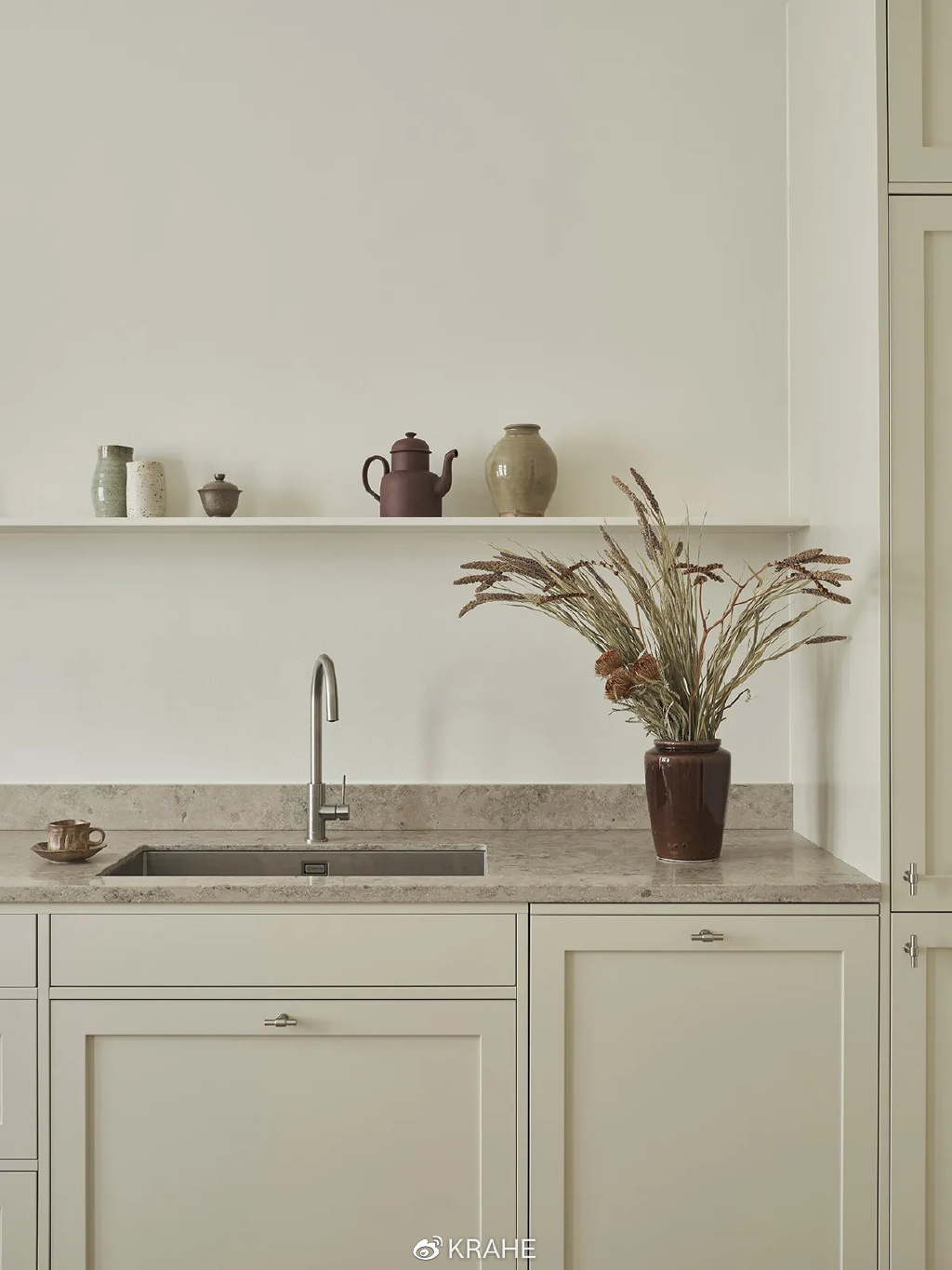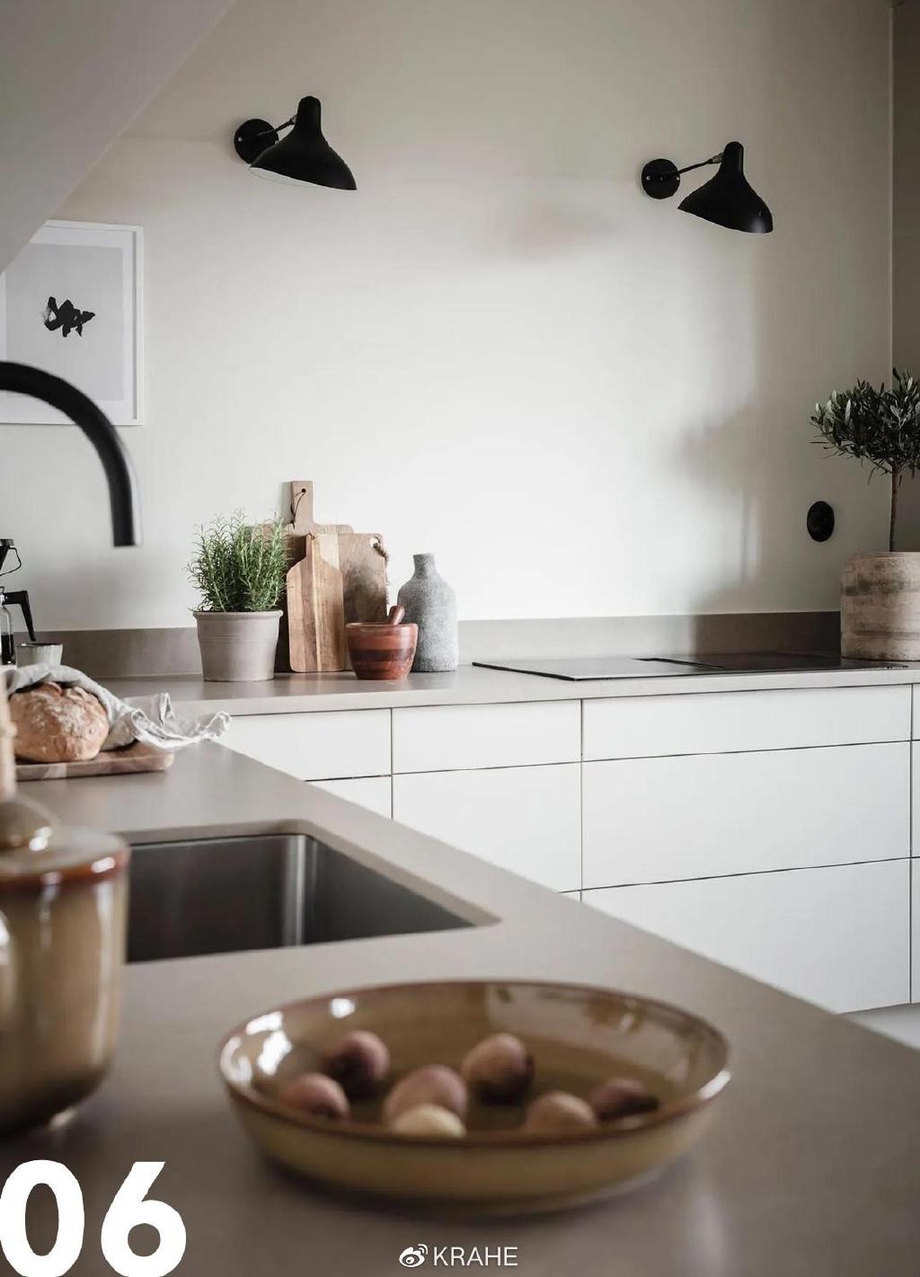 在上图中的厨房里,橱柜和墙面都是一样的米白色,与黑色水龙头和壁灯形成了色调上对比。