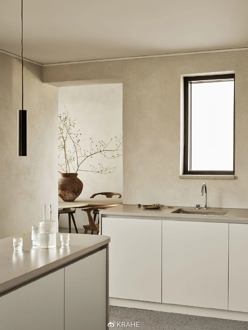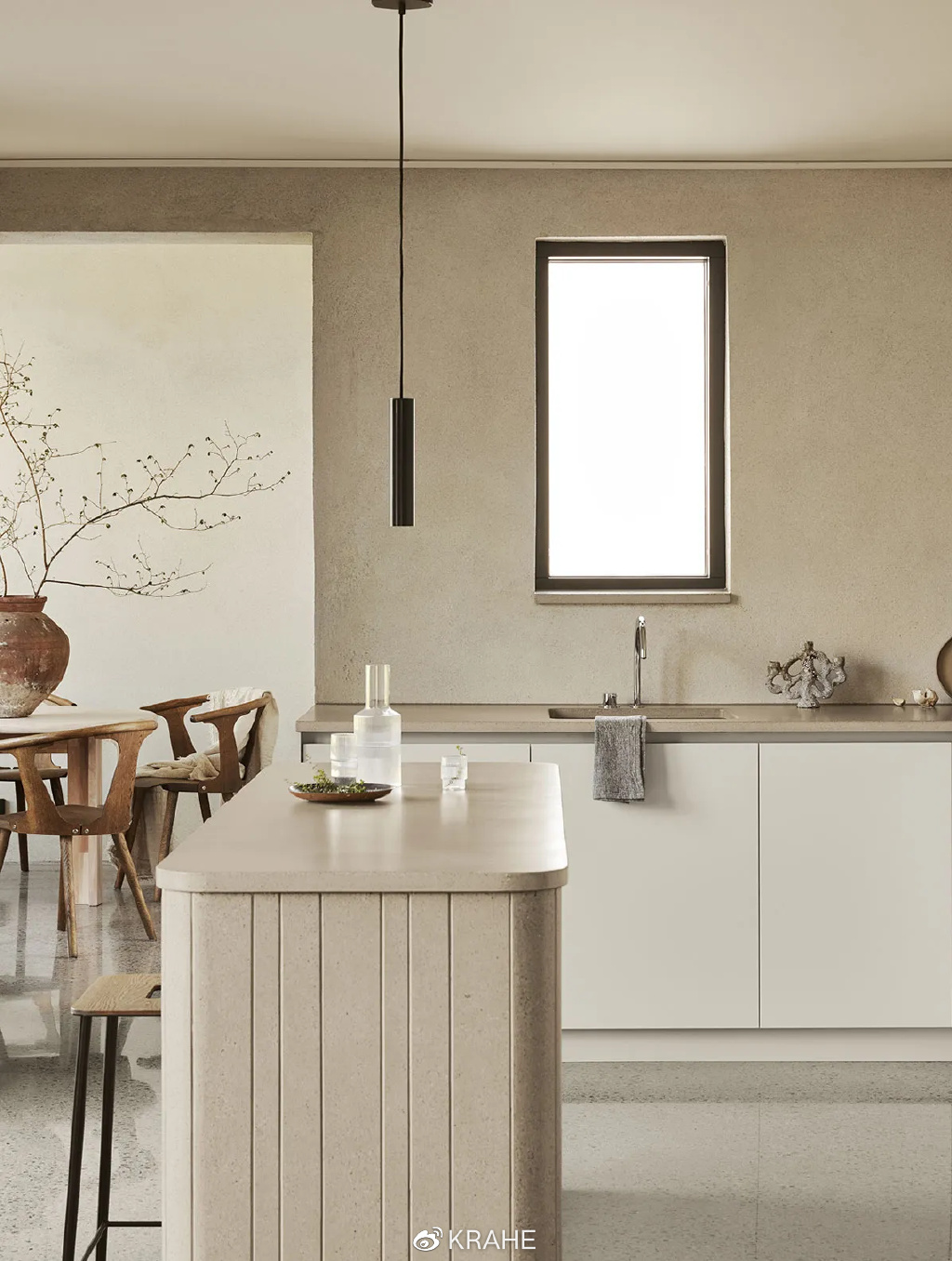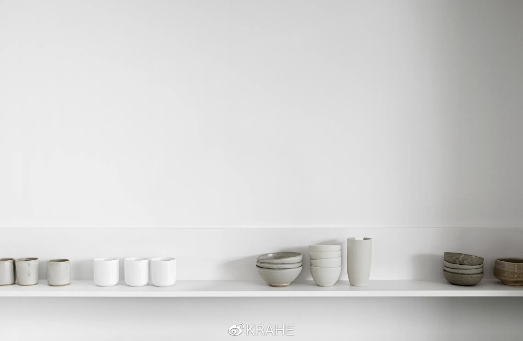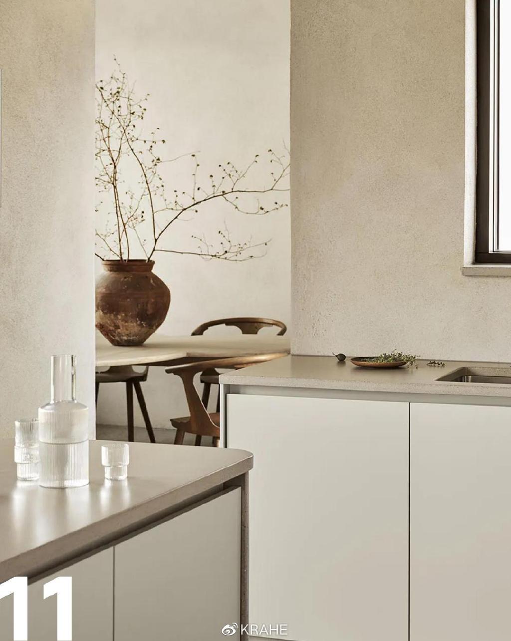 如果这间厨房铺的是瓷砖,最终效果绝对没有现在这样好。极简主义不是空无一物,装饰品也不是极简主义的敌人,真正破坏极简主义的是线条。