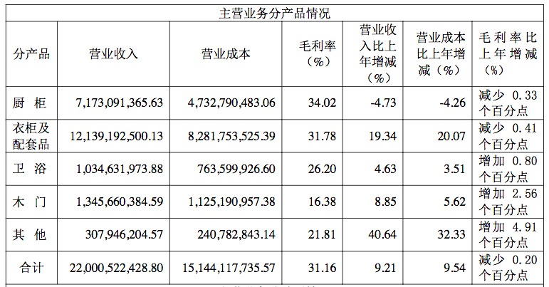 从具体产品看,2022年欧派家居的橱柜产品实现营收71.731亿元,同比下滑4.73%,毛利率34.02%,同比减少0.33个百分点;衣柜及配套品实现营收121.392亿元,同比增长19.34%,毛利率为31.78%,同比减少0.41个百分点;卫浴产品实现营收10.346亿元,同比增长4.63%,毛利率26.2%,同比增加0.8个百分点;木门产品实现营收13.457亿元,同比增长8.85%,毛利率为16.38%,同比增加2.56个百分点;其他产品实现营收3.079亿元,同比增长40.64%,毛利率为21.81%,同比增加4.91个百分点。