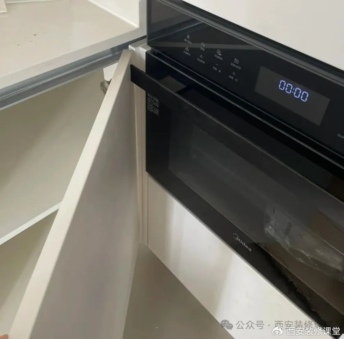 转角位置尽量不放嵌入式家电,如果要放,需要注意旁边门开启空间,否则刚好与电器把手冲突,导致翻车。